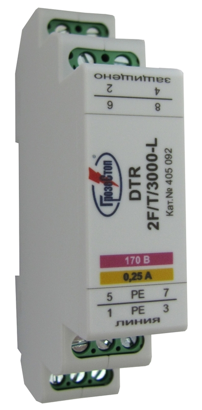 DTR - устройство для защиты оборудования слаботочных цепей с номинальным током IL= 250 мА, размещено в корпусе для крепления на DIN-рейку 35 мм;