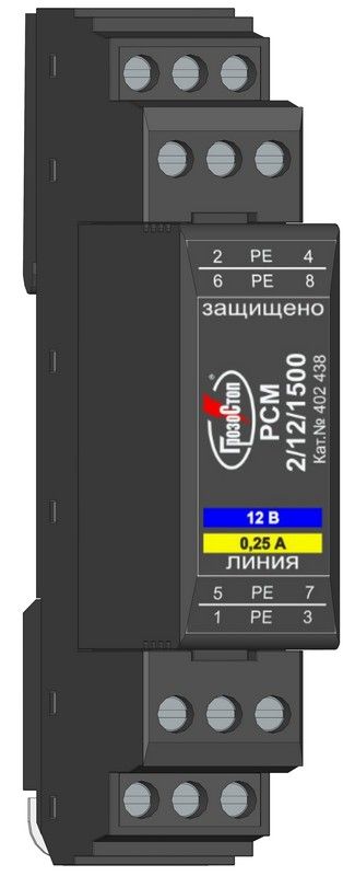 РСМ */**/1500, ТУ 3428-002-79740390-2007, УЗИП со сменным модулем для защиты оборудования распределенных сетей аппаратуры промышленной автоматизации (АСУ ТП, АСКУЭ и др.), цифровых интерфейсов передачи данных, сигнальных линий систем управления и измерения, а также для защиты вторичных цепей питания и др. от импульсных перенапряжений (грозовых, электростатических разрядов и др.). Количество защищаемых пар проводников 1-2. Uo = 6, 12, 24, 30, 48, 110 В DC; IL = 250 мА. In(8/20) = 20 кА. Скорость передачи данных до 1 Мбит/с.
