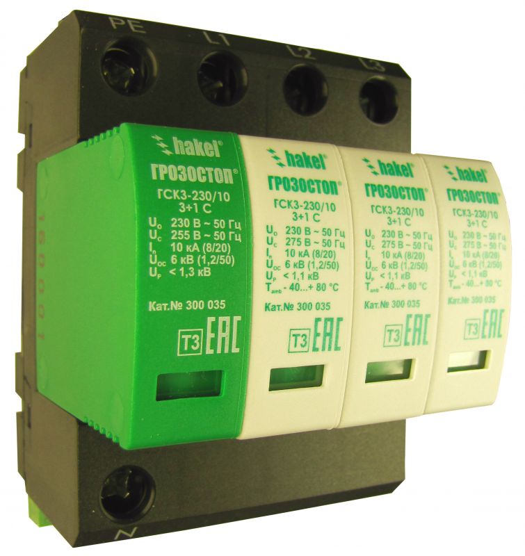 Пример: ГРОЗОСТОП® ГСК3-230/10 3+1 - УЗИП производства АО "Хакель" для защиты оборудования распределительных сетей до 1000 В комбинированного типа, УЗИП класса испытаний III в соответствии с ГОСТ IEC 61643-11, Uо=230 В АС, In(8/20)=10 кА, четыре полюса, схема включения для защиты от поперечных перенапряжений.