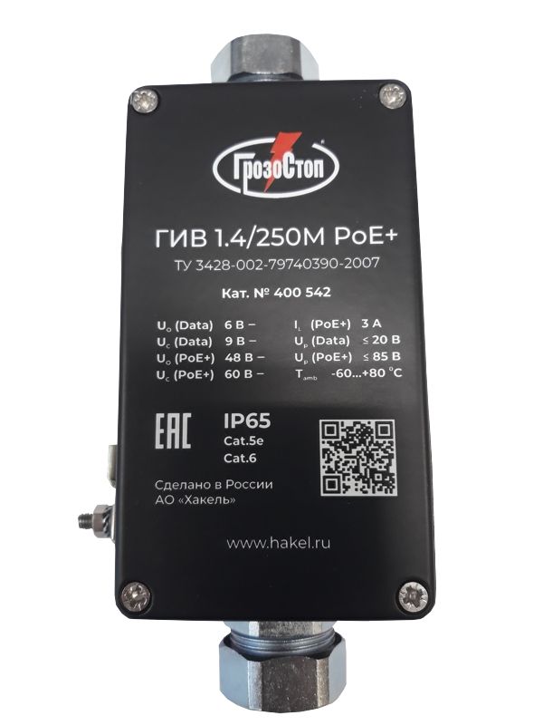 ГИВ 1.4/250M PoE+, ТУ 3428-002-79740390-2007 выполнен в металлическом корпусе, степень защиты IP65. Корпус оборудован гермовводами для подключения металлорукава диаметром 12 мм. Корпус оборудован болтом М4 для подключение проводника защитного заземления.
