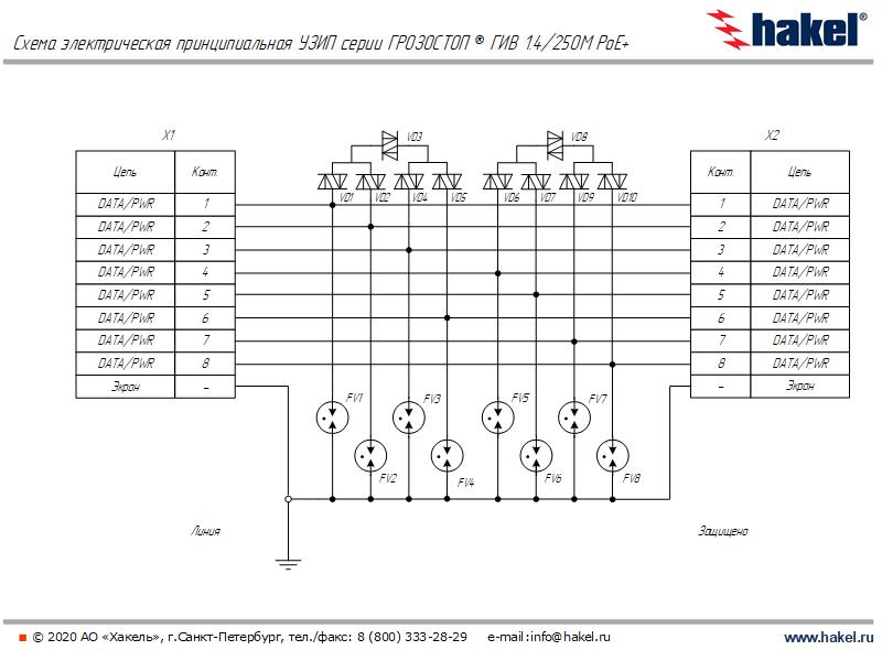 Защита проводников пар передачи данных и питания между собой выполнена на тиристорах, между проводниками и землёй на газонаполненных разрядниках.