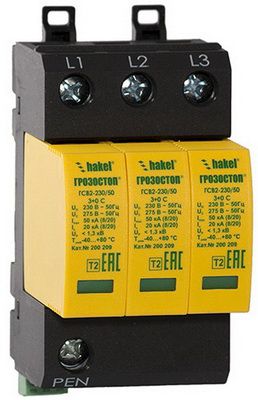 Пример: ГРОЗОСТОП® ГСВ2-230/50 3+0 С - УЗИП производства АО "Хакель" для защиты оборудования распределительных сетей до 1000 В ограничивающего типа, УЗИП класса испытаний II в соответствии с ГОСТ IEC 61643-11, UO=230 В АС, Imax(8/20)=50 кА, три полюса, схема включения для защиты от синфазных (продольных) перенапряжений. Для удаленного контроля рабочего состояния УЗИП дополнительно cнабжены “сухими” контактами дистанционной сигнализации. | | | |
