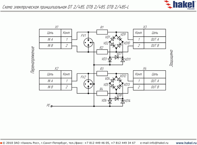Пример: DTB 2/485-L - устройство для защиты оборудования слаботочных цепей, размещено в корпусе для настеного крепления на DIN-рейку 35 мм, количество пар защищаемых проводников -2, номинальное рабочее напряжение Uo= 6 В, номинальный ток IL=100 мА, скорость передачи данных 10 Мбит/с. Применяются для защиты оборудования от заноса высокого потенциала со стороны 2-х линий RS 485. | | | |