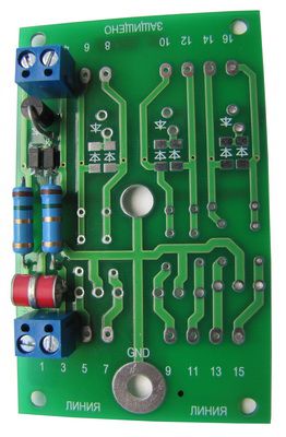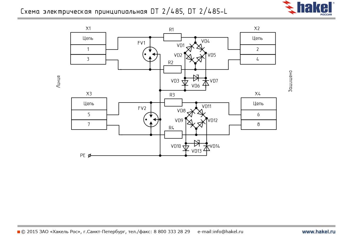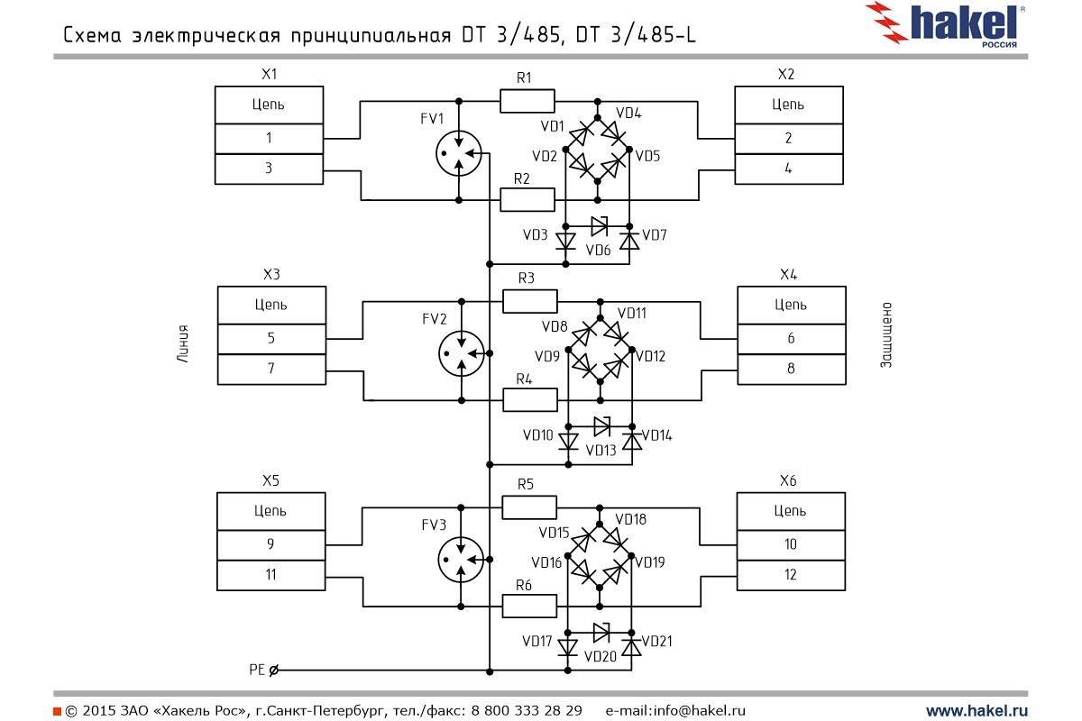Пример: DT 2/485 - УЗИП производства ЗАО "Хакель" для защиты оборудования слаботочных цепей, выполнено в виде печатной платы для установки в защищаемое оборудование, количество пар защищаемых проводников - 2, номинальное рабочее напряжение UO= 6 В DC, номинальный ток IL=100 мА, скорость передачи данных до 10 Мбит/с, первая ступень защиты выполнена на газонаполненных разрядниках с In (8/20)=20 кА, вторая ступень защиты выполнена на TVS-диодах с Рppm=1500 Вт. Применяются для защиты оборудования от заноса высокого потенциала со стороны линий RS-485. | |