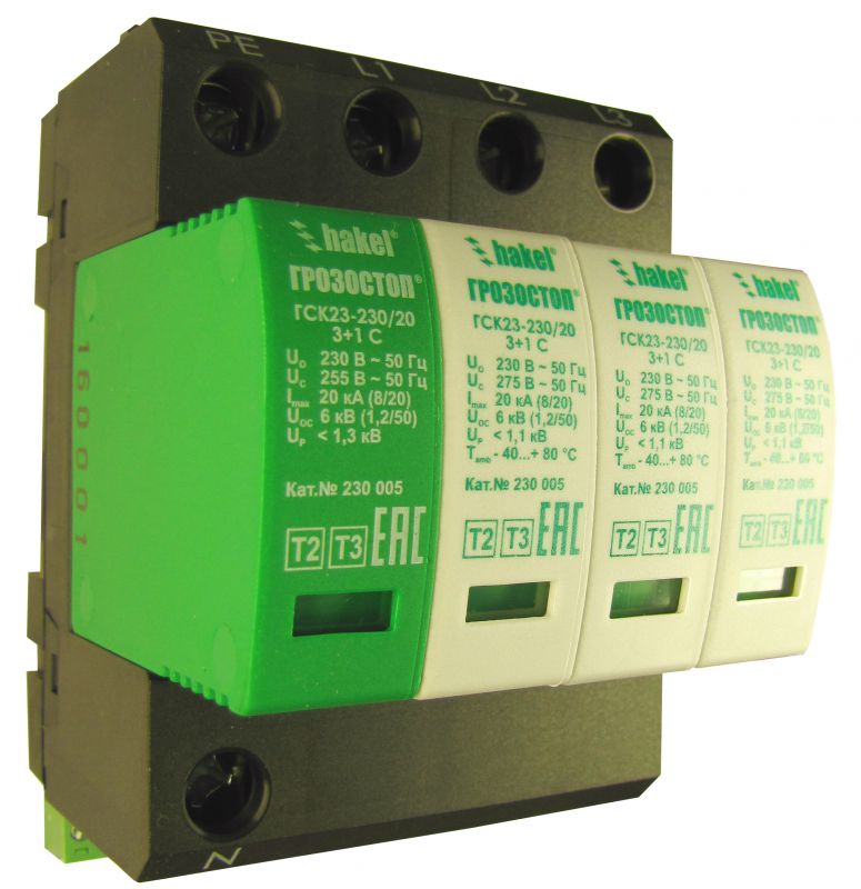 Пример: ГРОЗОСТОП® ГСК23-230/20 3+1 - УЗИП производства АО "Хакель" для защиты оборудования распределительных сетей до 1000 В комбинированного типа, УЗИП класса испытаний II+III в соответствии с ГОСТ IEC 61643-11, Uо=230 В АС, Imax(8/20)=20 кА, четыре полюса, схема включения для защиты от поперечных перенапряжений.
