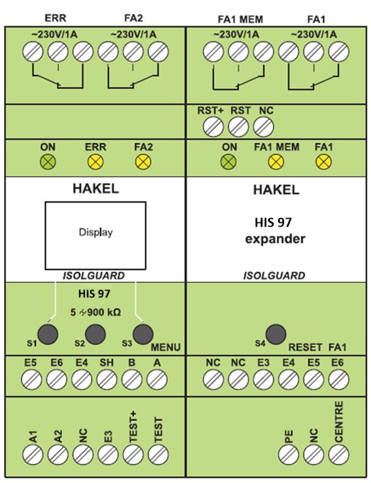 сигнальное реле FA1 с быстрой реакцией и MEM памятью предыдущих состояний сопротивления изоляции контролируемой сети;