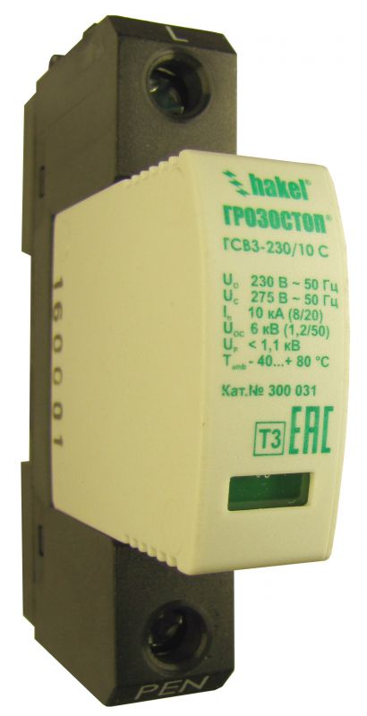 Пример: ГРОЗОСТОП® ГСВ3-230/10 - УЗИП производства АО "Хакель" для защиты оборудования распределительных сетей до 1000 В ограничивающего типа, УЗИП класса испытаний III в соответствии с ГОСТ IEC 61643-11, Uо=230 В АС, In(L/N)(8/20)=10 кА, один полюс.