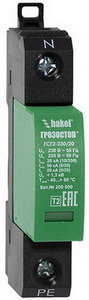 Пример: ГРОЗОСТОП® ГСГ2-230/20 - УЗИП производства АО "Хакель" для защиты оборудования распределительных сетей до 1000 В на основе газонаполненного разрядника, УЗИП класса испытаний II в соответствии с ГОСТ IEC 61643-11, UO=230 В АС, Iimp(10/350)=20 кА, один полюс.