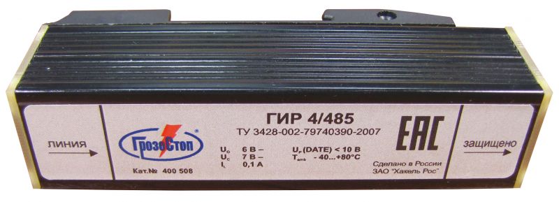 | УЗИП серии ГИР 4/485, ТУ 3428-002-79740390-2007 предназначены для защиты линий двухпроводного последовательного интерфейса RS-485 в пределах 0А(B) - 2 зон молниезащиты в соответствии с ГОСТ Р МЭК 62305-1.