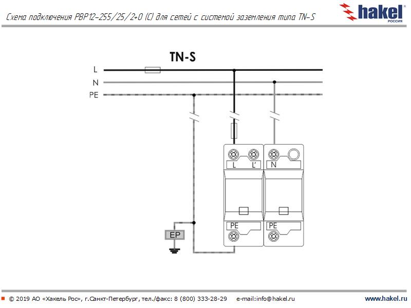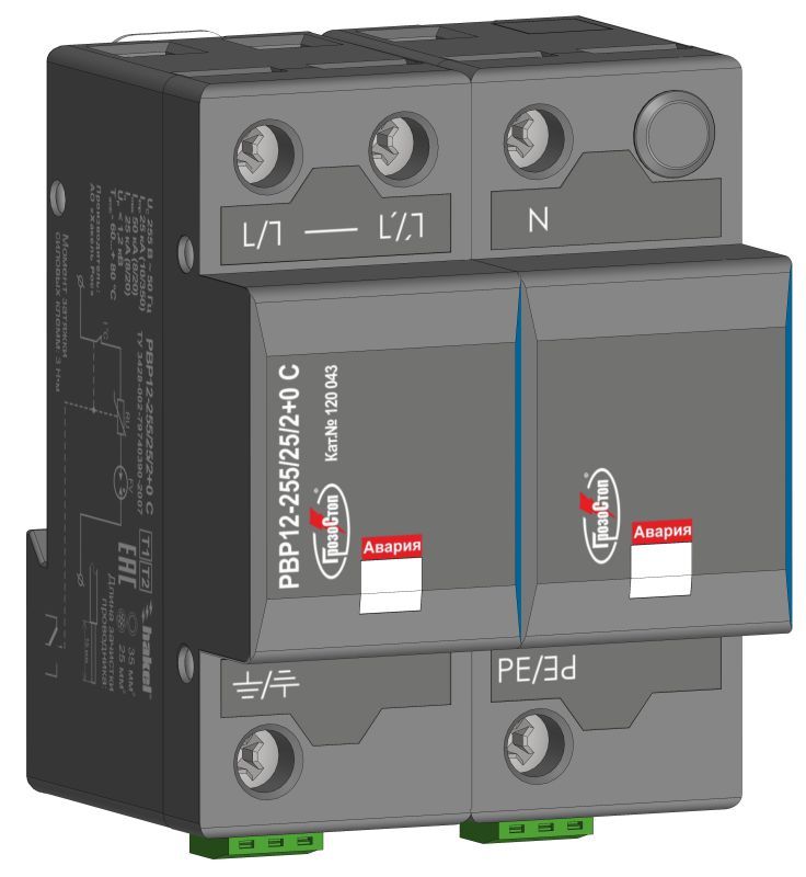 РВР12-255/25/2+0 * представляет собой двухполюсное УЗИП комбинированного типа, с последовательно установленными варистором и газонаполненным разрядником, предназначенное для защиты силовых цепей переменного тока при кабельном или воздушном вводе электропитания в сетях с системами заземления типа TN-S и ТТ. Конструкция УЗИП позволяет выполнить «V»-образное (проходное) подключение фазных проводников.