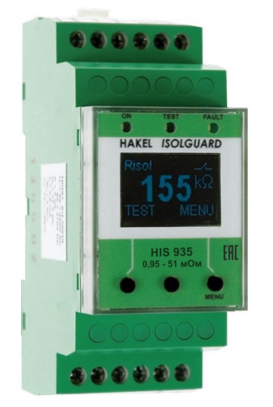 HIS 935 - предназначен для непрерывного контроля сопротивления изоляции одно- и трёхфазных незаземлённых IT-сетей переменного тока с номинальным напряжением до 275 В относительно земли (для подвижных объектов – относительно корпуса электроустановки) и сигнализации падения этого сопротивления ниже установленного значения срабатывания с возможностью подключения модуля дистанционной сигнализации MDS-D и передачи данных по интерфейсу RS-485 с использованием протокола ISOLGUARD. Для контроля сетей с бóльшим номинальным напряжением необходимо использовать соответствующие дроссели серии TL (Hakel) для создания «искусственной средней точки». Диапазон установки значений срабатывания 200 - 900 кОм.