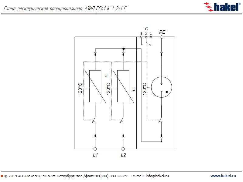 УЗИП типа ГСА1 К * 2+1 С представляет собой двухполюсный УЗИП класса I (ГОСТ IEC 61643-11-2013) комбинированного типа с «Т-образной» схемой защиты на основе оксидно-цинковых варисторов и газонаполненного разрядника.