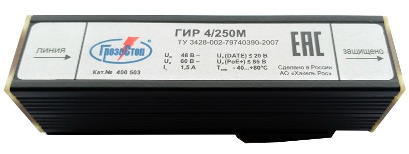 Устройство ГИР 4/250М предназначено для защиты от импульсных перенапряжений (грозозащита, защита от электростатических разрядов и др.) оборудования локальных вычислительных сетей категорий Cat.5e и Cat.6 (ISO/IEC 11801:2010, TIA/EIA-568Bс) с интерфейсами Ethernet стандартов 1000BASE-T (IEEE 802.3ab-1999), 10GBase-T (IEEE 802.3an-20099) в пределах 0B - 2 зон молниезащиты (в соответствии с «Инструкцией по устройству молниезащиты зданий, сооружений и промышленных коммуникаций» СО–153-34.21.122-2003 и ГОСТ Р МЭК 62305-1).