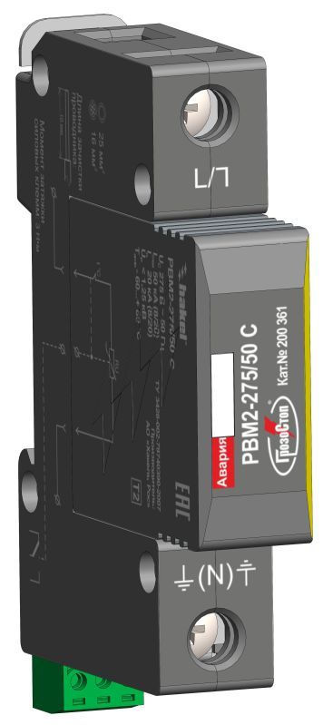 класса испытаний II в соответствии с ГОСТ IEC 61643-11; Uc = 75 В АС, Imax (8/20) = 40 кА. Для удаленного контроля рабочего состояния УЗИП дополнительно снабжено “сухим” контактом дистанционной сигнализации.