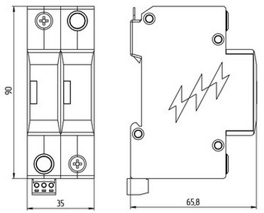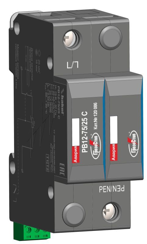 РВ12-75/25 * представляет собой однополюсное УЗИП ограничивающего типа предназначенное для защиты силовых цепей переменного и постоянного тока при кабельном или воздушном вводе электропитания в сетях с системами заземления типа TN-С.