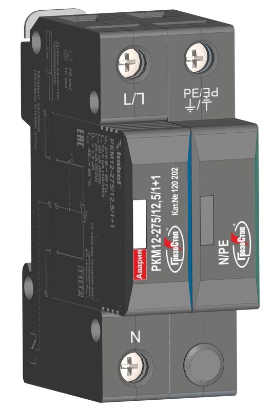 Пример: РКМ12-275/12,5/1+1 С - двухполюсное модульное УЗИП комбинированного типа торговой марки ГРОЗОСТОП® производства АО "Хакель" для защиты оборудования распределительных сетей до 1000 В, класса испытаний I+II в соответствии с ГОСТ IEC 61643-11; Uc=275 В АС, Iimp=12.5 кА. Для удаленного контроля рабочего состояния УЗИП дополнительно снабжено “сухим” контактом дистанционной сигнализации. | |
