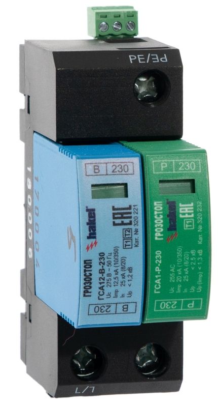 УЗИП типа ГСА12 К 230 1+1 С представляет собой однополюсный УЗИП класса I+II (ГОСТ IEC 61643-11-2013) комбинированного типа на основе последовательно соединённых оксидно-цинкового варистора и газонаполненного разрядника.