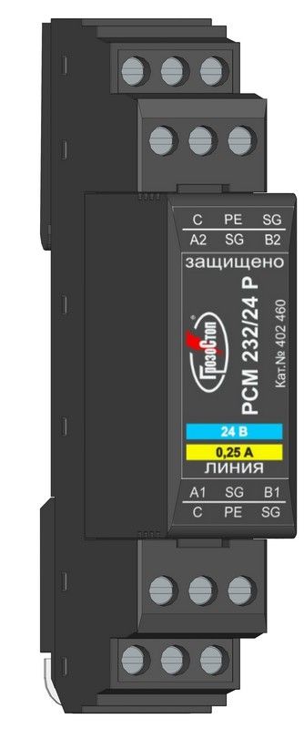 РСМ 232/24 Р, ТУ 3428-002-79740390-2007, УЗИП со сменным модулем, предназначено для защиты линий последовательного трёхпроводного интерфейса RS-232 (с сигнальной землёй) со скоростью передачи данных до 10 Мбит/с от импульсных перенапряжений (грозовых, электростатических разрядов и др.). Количество защищаемых пар проводников 1. Uo = 24 В DC; IL = 250 мА. In(8/20) = 20 кА. Возможность подключения экрана кабеля через шунтирующую
