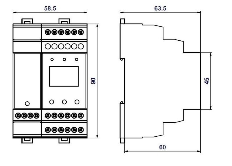 - Прибор размещен в двойном пластмассовом корпусе общей шириной 59 мм, устанавливаемом на 35 мм DIN-рейку.