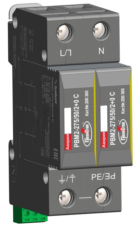 Пример: РВМ2-75/40/2+0 С - двухполюсное УЗИП ограничивающего типа со сменными варисторными модулями серии РУБЕЖ производства