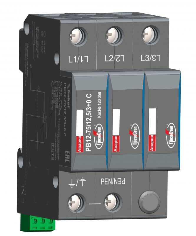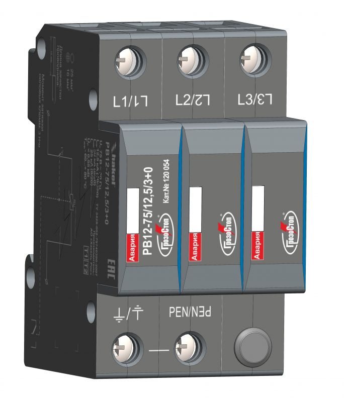 Пример: РВ12-75/12,5/3+0 С - трехполюсное УЗИП ограничивающего типа торговой марки ГРОЗОСТОП® производства
