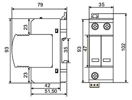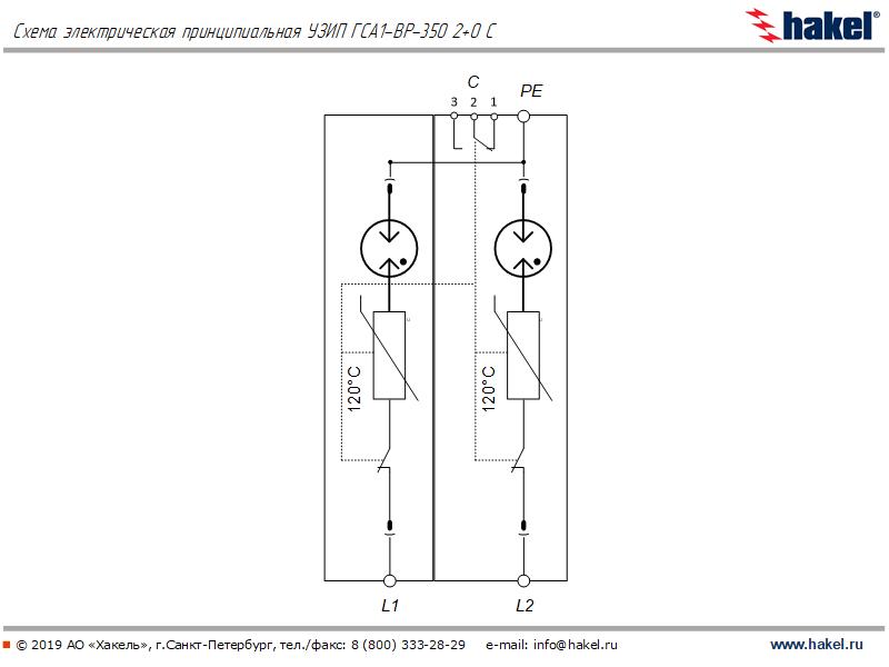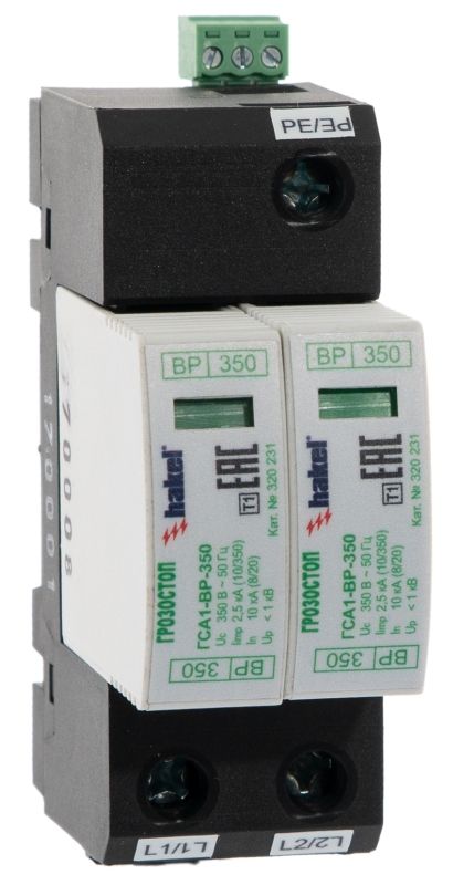 УЗИП типа ГСА1 ВР 350 2+0 С представляет собой двухполюсный УЗИП класса I (ГОСТ IEC 61643-11-2013) комбинированного типа на основе последовательно соединённых оксидно-цинкового варистора и газонаполненного разрядника.