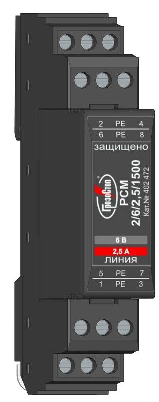 РСМ */**/2.5/1500, ТУ 3428-002-79740390-2007, УЗИП со сменным модулем, предназначено для защиты оборудования распределенных сетей аппаратуры промышленной автоматизации (АСУ ТП, АСКУЭ и др.), цифровых интерфейсов передачи данных, сигнальных линий систем управления и измерения, а также для защиты вторичных цепей питания и др. от импульсных перенапряжений (грозовых, электростатических разрядов и др.) Количество защищаемых пар проводников 1-2. Uo = 6, 12, 24, 30, 48, 110 В DC. IL = 2.5 А. In(8/20) = 20 кА. Скорость передачи данных до 1 Мбит/с.