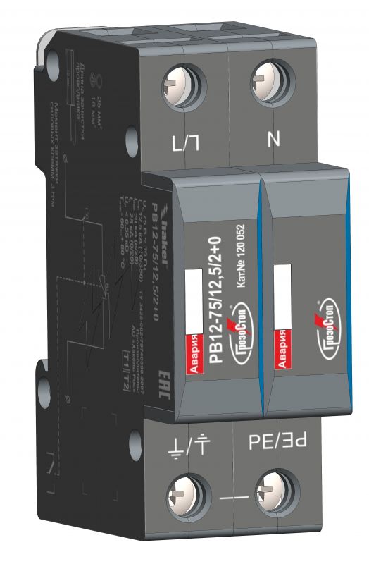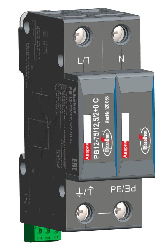 Пример: РВ12-75/12,5/2+0 С - двухполюсное УЗИП ограничивающего типа торговой марки ГРОЗОСТОП® производства