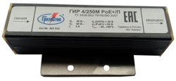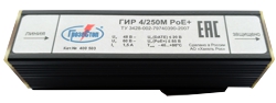 ГИР 4/250M PoE+, ТУ 3428-002-79740390-2007 выполнен в металлическом корпусе с замком для крепления на рейку DIN 35мм. Модификация устройства ГИР 4/250M PoE+/П с индексом "П" выполнена с пластиной для крепления к плоской поверхности (монтажная панель).