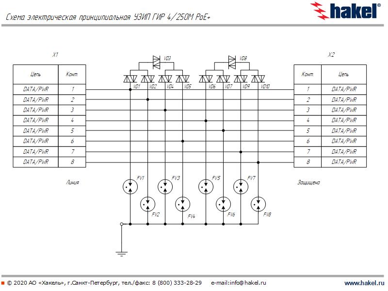 Защита проводников пар передачи данных и питания между собой выполнена на тиристорах, между проводниками и землёй на газонаполненных разрядниках.