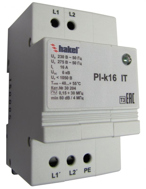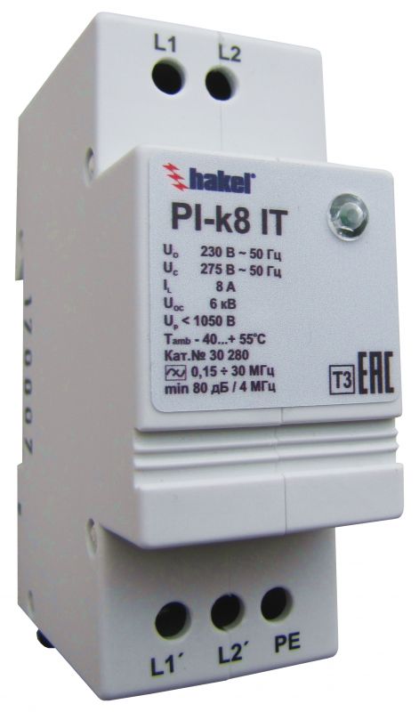 Помехоподавляющие фильтры серии PI-k* IT (DS) со встроенным УЗИП класса испытаний III, согласно ГОСТ Р 51992 (ГОСТ IEC 61643-11), предназначены для защиты чувствительного электронного оборудования от высокочастотных помех и импульсных перенапряжений в низковольтных силовых распределительных системах переменного/постоянного тока с системой заземления типа IT.