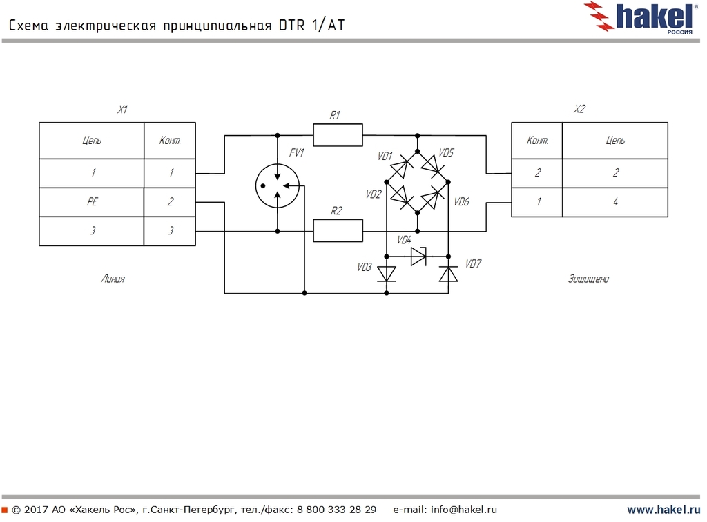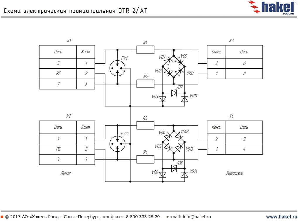 Пример: DTR 2/AT - УЗИП производства АО "Хакель" для защиты оборудования слаботочных цепей, размещено в корпусе для крепления на DIN-рейку 35 мм, количество пар защищаемых проводников - 2, номинальное рабочее напряжение Uo= 170 В DC, номинальный ток IL=250 мА, скорость передачи данных 10 Мбит/с, первая ступень защиты выполнена на газонаполненных разрядниках с In (8/20) = 20 кА, вторая ступень защиты выполнена на TVS-диодах с Рppm=1500 Вт. Применяются для защиты оборудования от заноса высокого потенциала со стороны телефонных линий. | |