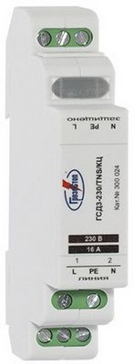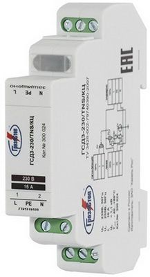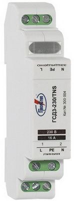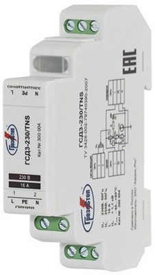 ГСД3-230/TNS/**, размещён в корпусе для крепления на рейку DIN 35 мм. Имеет в своём составе в цепи L/N варисторы, в цепи N/PE газонаполненный разрядник. Варисторы снабжены встроенным терморасцепителем, который срабатывает при повреждении (перегреве) варистора.