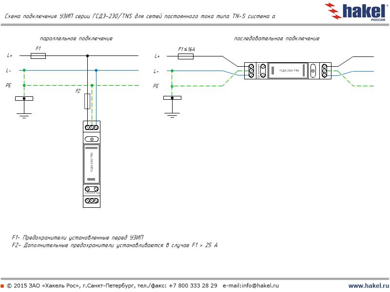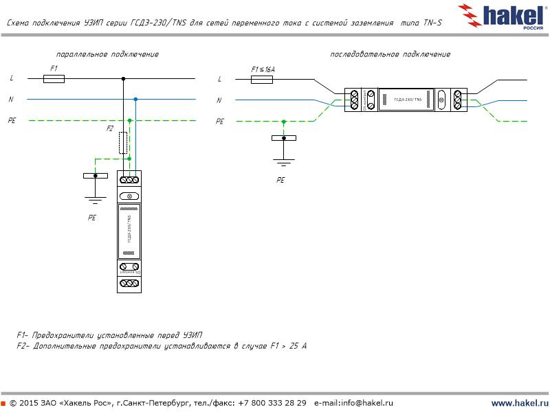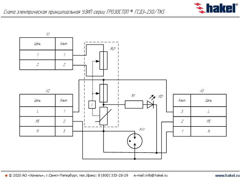 Пример: ГРОЗОСТОП® ГСД3-230/TNS - УЗИП производства АО "Хакель" для защиты оборудования распределительных сетей до 1000 В комбинированного типа, УЗИП класса испытаний III в соответствии с ГОСТ IEC 61643-11, Uо = 230 В АС, тип системы заземления TN-S.