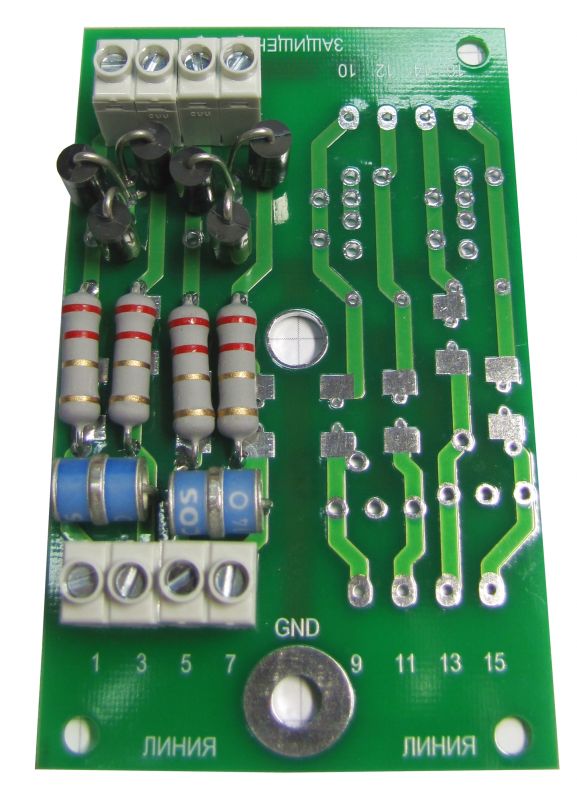 | УЗИП в виде печатной платы. Количество защищаемых пар проводников 1-4. Uo= 6, 12, 24, 30, 48, 60, 80, 110, 170 В DC. IL=100 мА. In(8/20)=20 кА. В УЗИП применяются TVS-диоды с Рppm=1500 Вт. Скорость передачи данных до 1 Мбит/с.