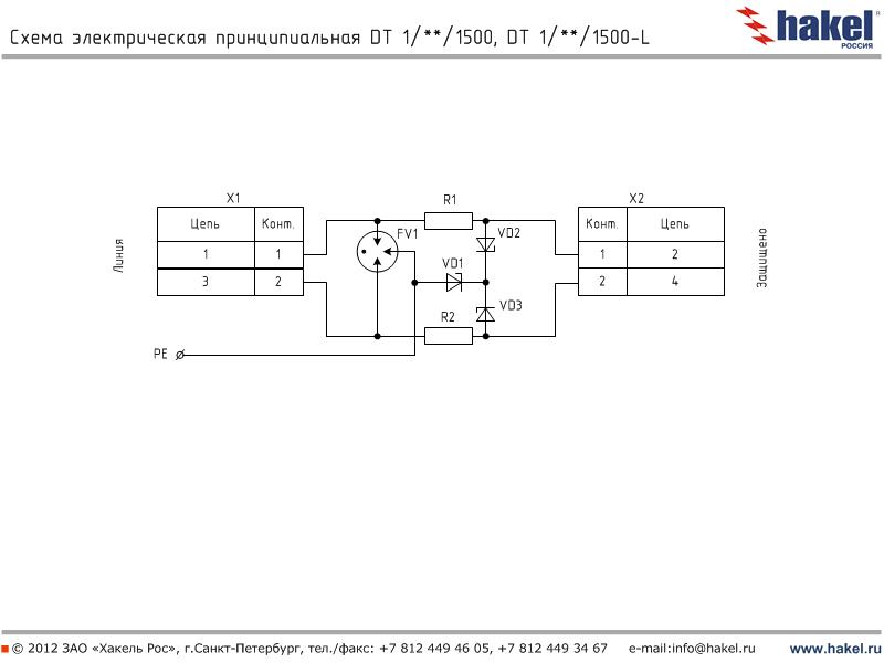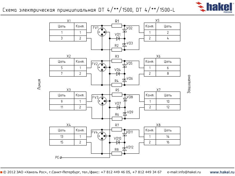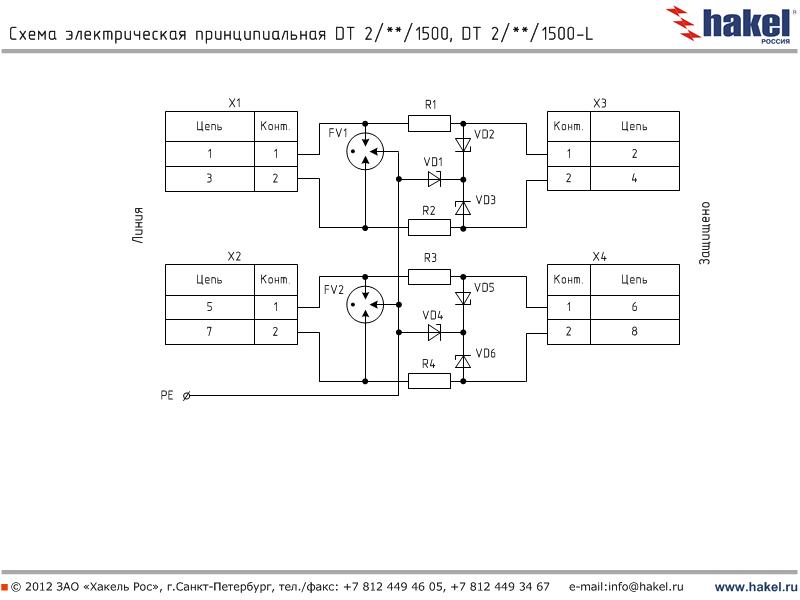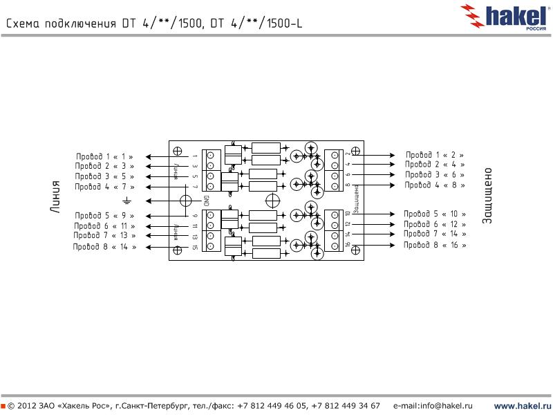 Пример: DT 2/6/1500 - устройство для защиты оборудования слаботочных цепей с номинальным током IL=100 мА, выполнены в виде печатной платы для установки в защищаемое оборудование, количество пар защищаемых проводников -2, номинальное рабочее напряжение Uo= 6 В DC, вторая ступень защиты выполнена на TVS-диодах с Рppm=1500 Вт | |